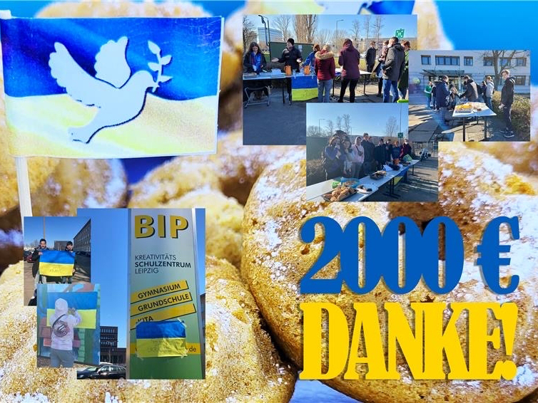 Die Schülerinnen und Schüler der Kl. 10b haben gemeinsam mit ihrer Klassenleiterin Dr. Anja Seiffert und mit Hilfe ihrer Eltern am 11.03.2022 vor dem Schulzentrum einen Spenden- und Kuchenbasar zur Unterstützung der Ukraine durchgeführt.