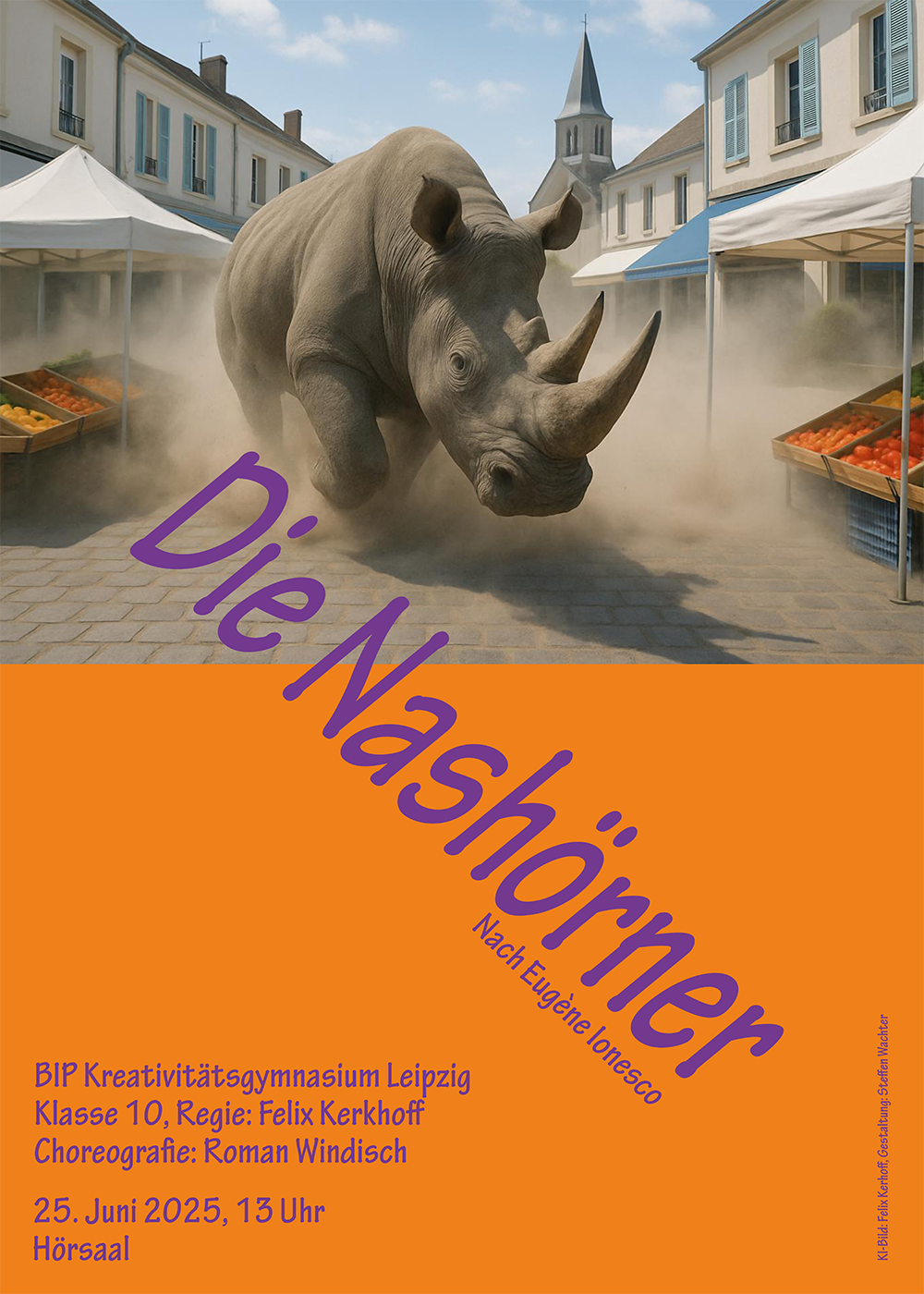 Das Auftauchen der Dickhäuter erregt zuerst größte Empörung bei den Bewohnern einer Kleinstadt — doch nicht alle sind der Idee der Vernashornung völlig abgeneigt. Und eine mysteriöse Epidemie breitet sich aus … Wird unser Held Herr Behringer es schaffen, sich seine Menschlichkeit bis zuletzt zu bewahren? Die Profilgruppen Darstellendes Spiel und Tanz der 10. Klasse (mit der besonderen Unterstützung einer Schülerin aus Klasse 11) haben sich in diesem Schuljahr für ihr Abschlussstück Eugène Ionescos Klassiker des Absurden Theaters vorgenommen. Und sie haben mit großer Spielfreude und bemerkenswertem Einsatz in wenigen Probenwochen eine wirklich unvergessliche Inszenierung geschaffen. Sie haben die archetypischen Figuren mit Leben gefüllt und es ist ihnen gelungen, trotz der Absurdität und der klamaukigen, rasanten Erzählweise ihren Rollen treu zu bleiben und sie empathiefähig zu verkörpern. Im Tanz wurde mit präziser Variation der Bewegungsqualitäten der Kontrast zwischen Bedrohung und Anziehung, die von den Bestien gleichermaßen ausgehen, spürbar gemacht. Eine Glanzleistung! Als letzter Profiljahrgang, der noch nicht im neuen PODIUM spielen konnte, haben sie es außerdem geschafft, aus einem Nicht-Theaterraum, unserem Hörsaal, eine Bühne zu machen: Ohne Lichteffekte, ohne Tontechnik, ohne Bühnenbild und ohne aufwändige Kostüme. Getreu dem Motto des großen Peter Brook: "ch kann jeden Raum nehmen und in eine Bühne verwandeln." – Und nach der Aufführung wurde von Schulleiter Prof. Dr. Frank Schulz direkt die Erwartung ausgesprochen, diese Inszenierung nach Eröffnung der neuen Halle wiederaufzunehmen. Die Nashornigkeit ist also noch lange nicht zu Ende …