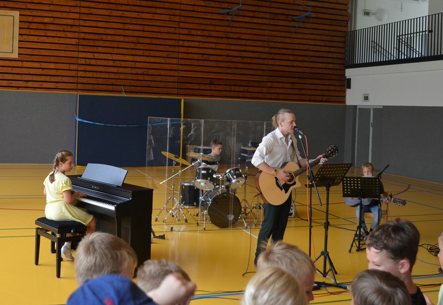 Am Mittwoch unserer Schultheaterwoche lud Herr Küttler zum Konzert. Die Turnhalle war gut gefüllt, 12 Klassen mit Lehrern und Lehrerinnen sowie Eltern, Großeltern und vielen weiteren Gästen besetzten die Plätze.