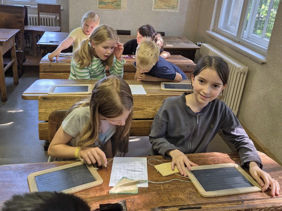 Heute früh haben wir uns um 8 Uhr im Klassenzimmer zum Frühstück getroffen. Mit Bahn und Bus sind wir anschließend ins Schulmuseum nach Ebersdorf gefahren.