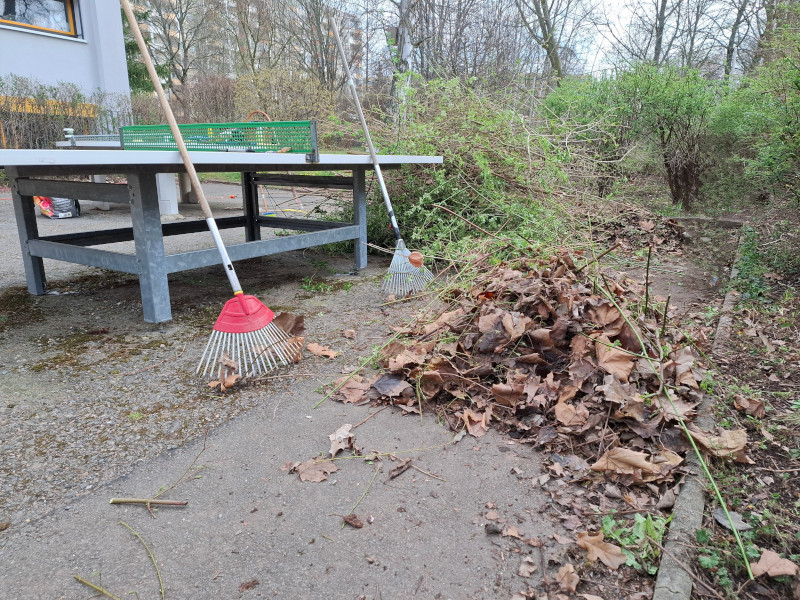 Am 05.04.2025 startete zum ersten Mal unsere Aktion "Schickes Schulgelände". Um die 20 Elternhäuser, einige Großeltern sowie eine Fachfirma hatten sich eingefunden und brachten jede Menge Gerätschaften mit.