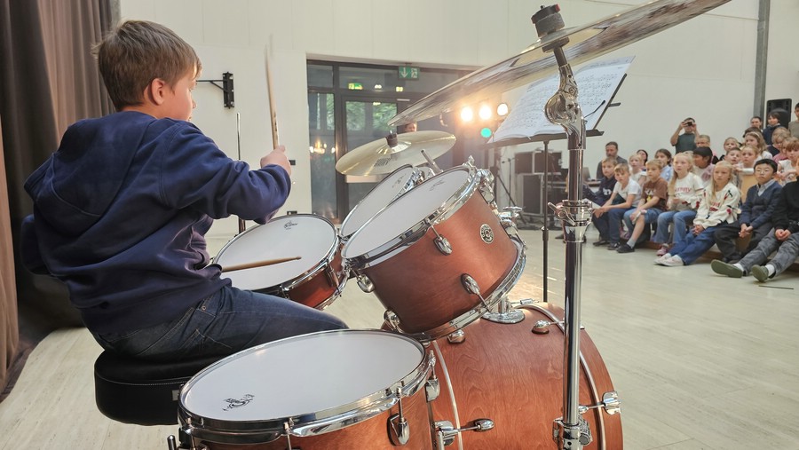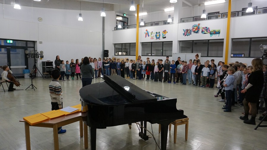 Kraftvoll und rund breitet sich der Klang des Cellos von Bence (Kl. 2a) in der Aula aus. Vier Klassen schauen ihn erwartungsvoll an.