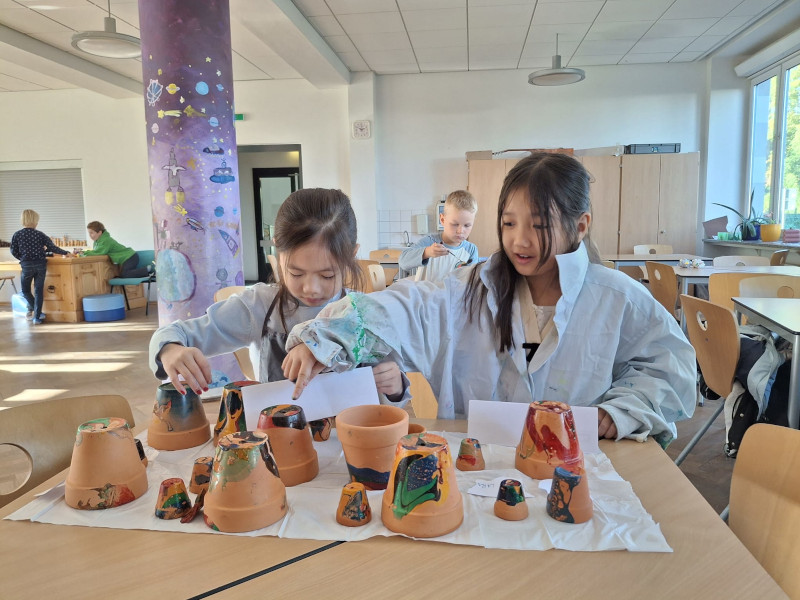 Zum Thema "Die vier Urelemente in der Kunst" gestalteten die Kinder mit Tempera Bilder über das Wasser und die Luft sowie deren Lebenswelt.
