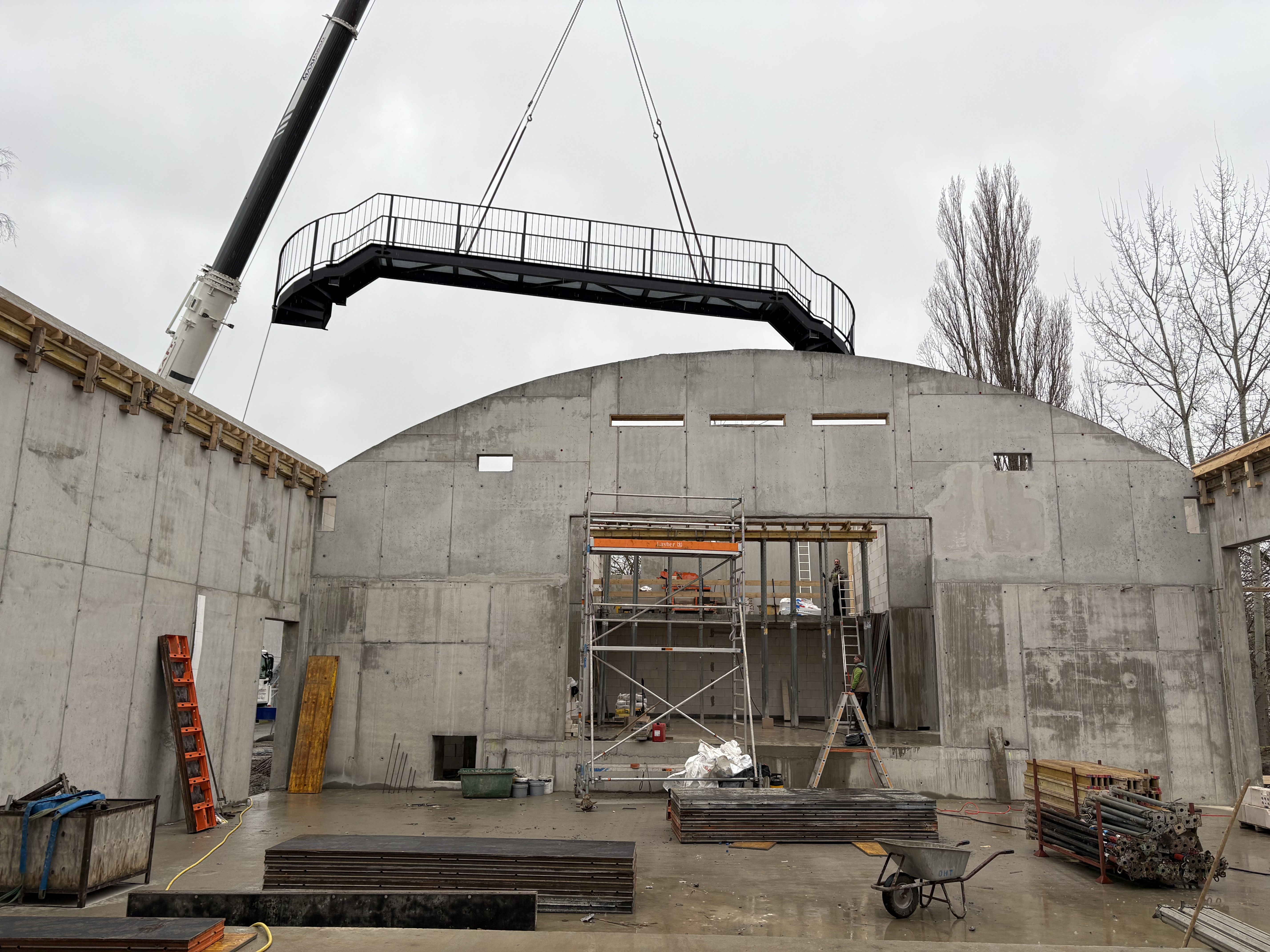 Am 28.01.2025 wurde in den Rohbau unserer Mehrzweckhalle eine von der Dresdner Firma Metallbau Künstner gefertigte Brücke eingehoben.