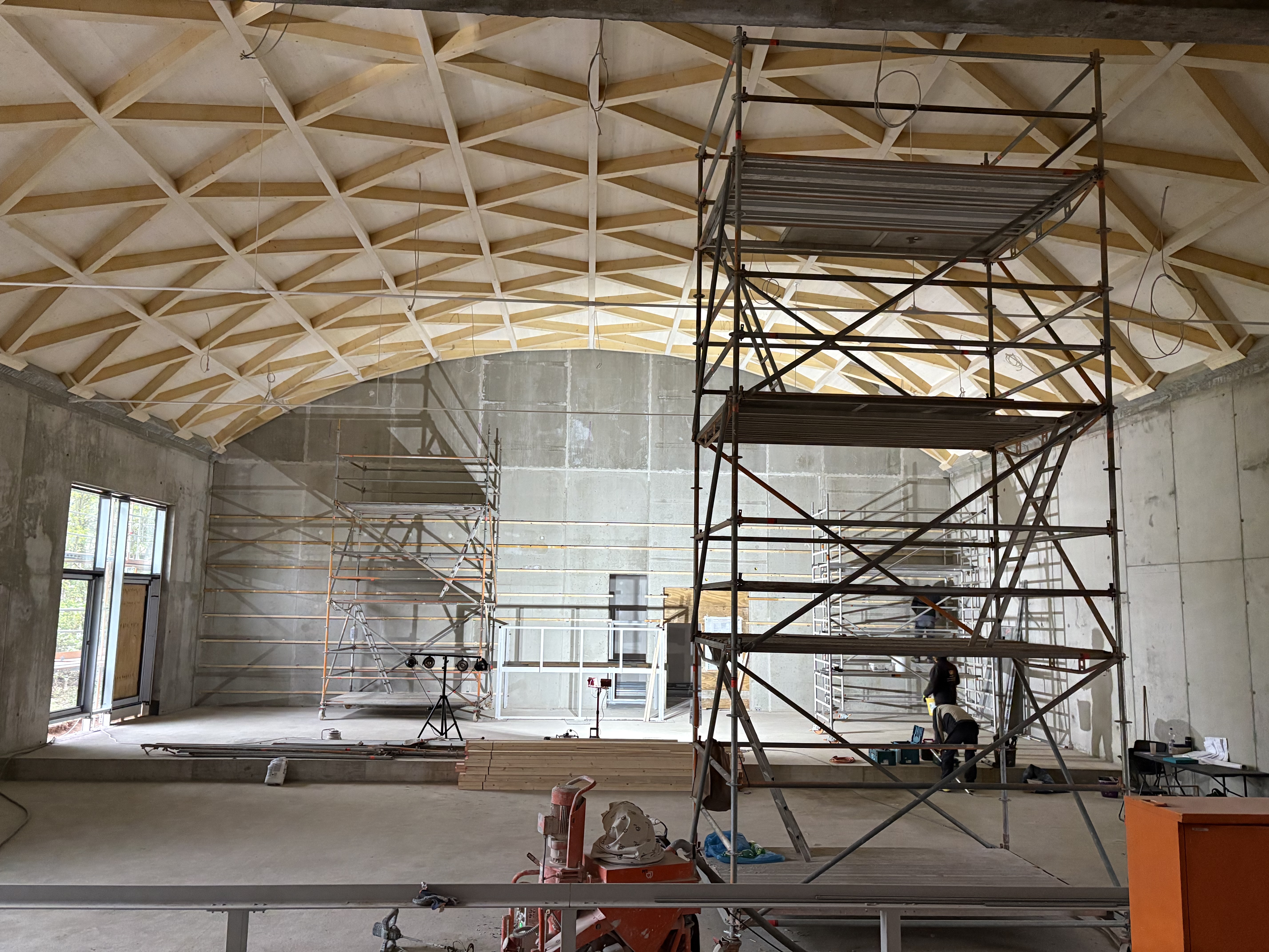 Unsere im Bau befindliche Mehrzweckhalle ist eingedeckt. Die Decke zeigt sich dem Publikum in einer wunderschönen Holzgestaltung: ein komplexes Balken-Netzwerk.