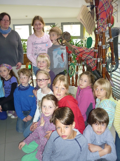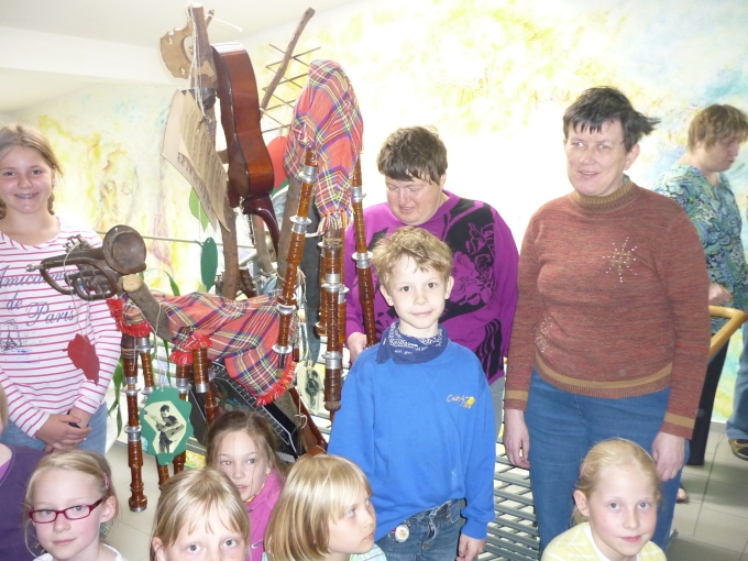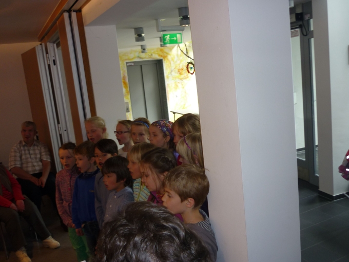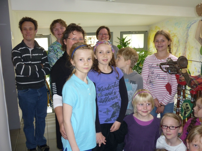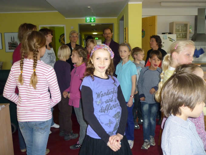 Der während der Glücks-Projektwoche 2011 entstandene Instrumentenbaum fand nun in diesem Wohnheim einen tollen Platz. Die verarbeiteten Instrumente interessierten etliche Heimbewohner sehr. Wir wollten den Baum aber natürlich nicht einfach nur hinstellen, sondern das Geschenk sollte mit Musik verbunden sein. Deshalb machten wir uns auf den Weg, die Heimbewohner kennen zu lernen. Dort angekommen, wurden wir von den Mitarbeitern und den Bewohnern herzlich begrüßt. Sie versammelten sich extra für uns in einem Gemeinschaftsraum. Wir sangen ihnen einige Lieder vor: "Zaubergeheimnisse", "Alles fauler Zauber", "Alle Vögel sind schon da". Außerdem haben wir auch Musikinstrumente gesungen. Als wir "Summ, summ, summ" und "Tiri Tomba" sangen, stimmten sogar einige Zuhörer mit ein. Nach unserem kurzen Auftritt zeigten uns die Betreuer des Hauses einige Zimmer. Wir konnten uns den Sportraum, den Ruheraum sowie Einzel- und Doppelzimmer ansehen. Die Aufführung hat den Bewohnern des Heimes und uns viel Freude bereitet.